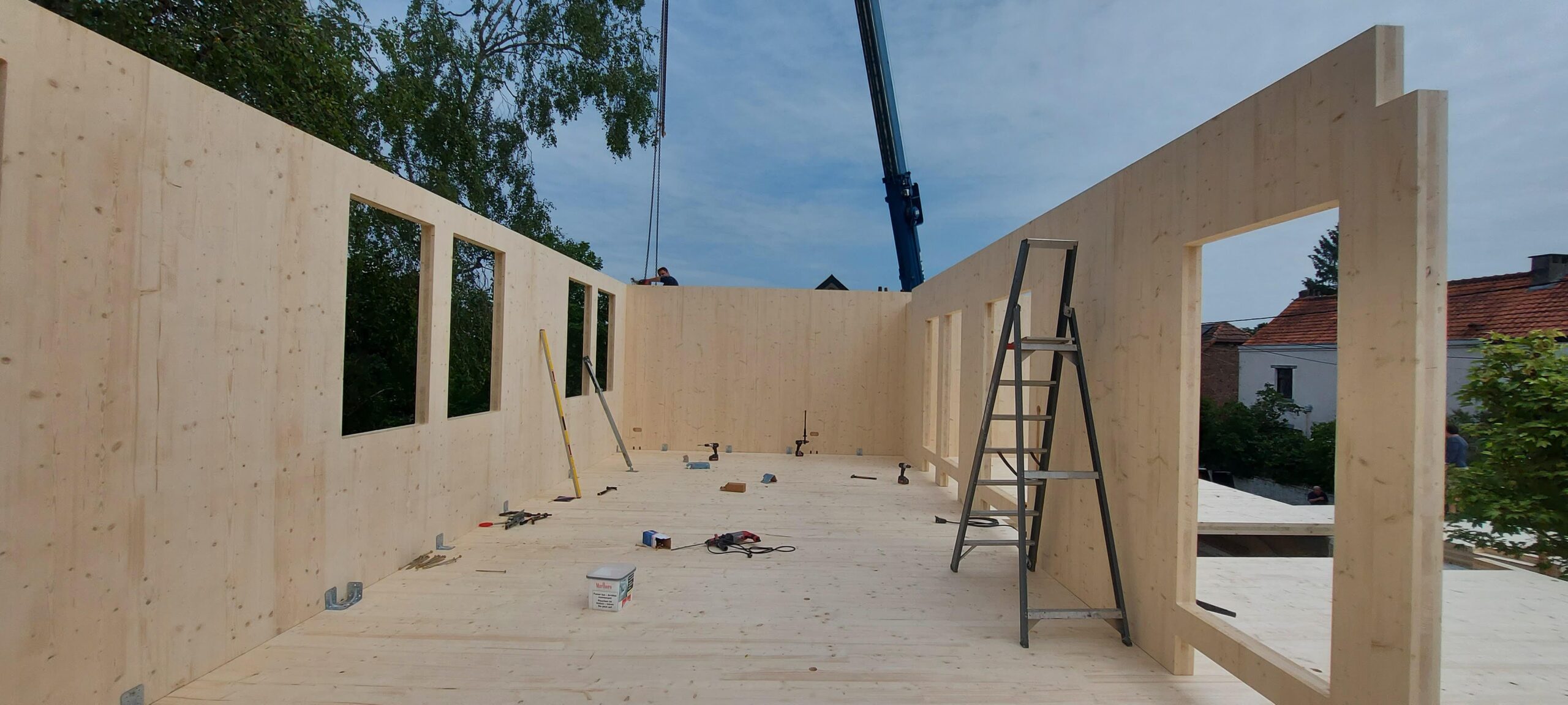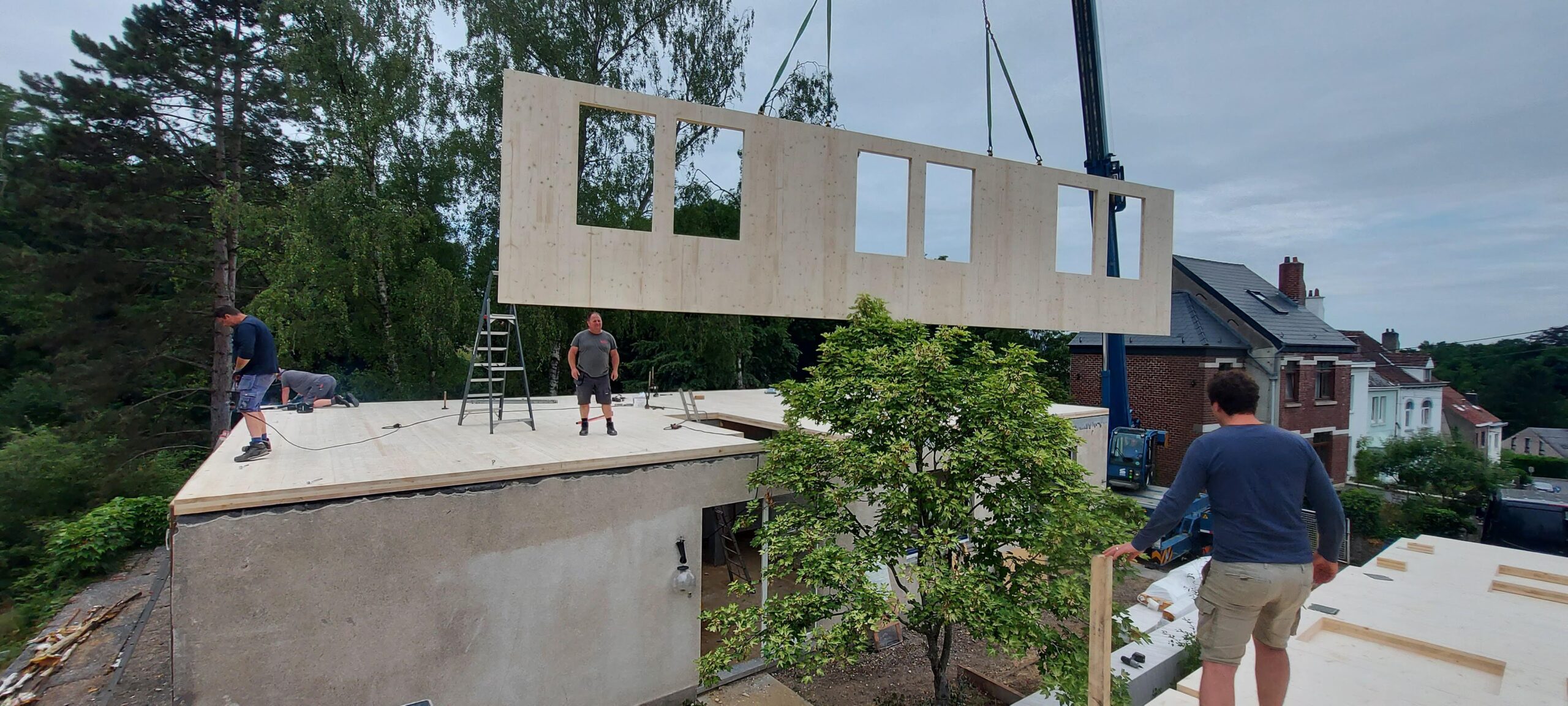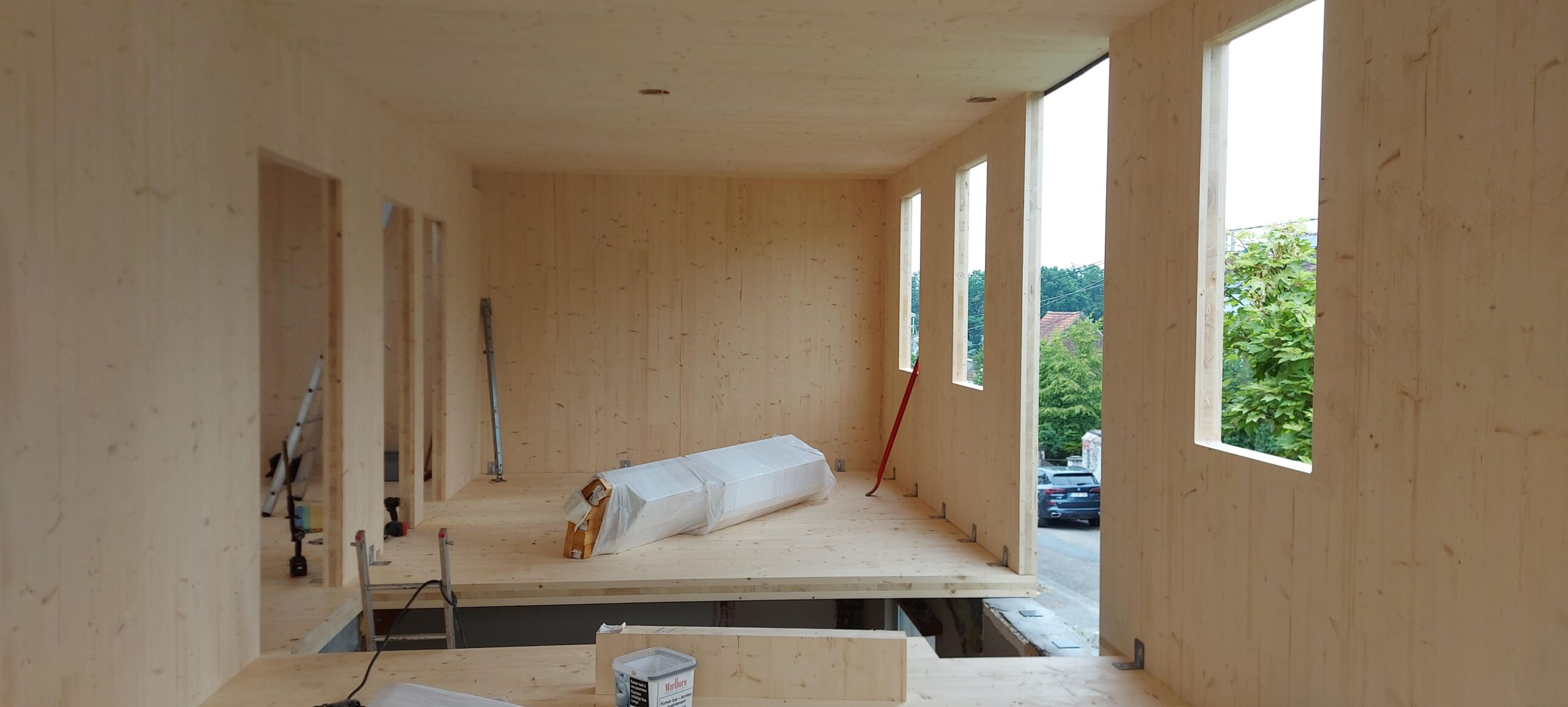 Cette méthode de construction a permis une exécution très rapide du gros œuvre, avec seulement 3 jours pour la mise en place du CLT, 1 jour pour les châssis et 3 semaines pour la toiture et le revêtement extérieur.