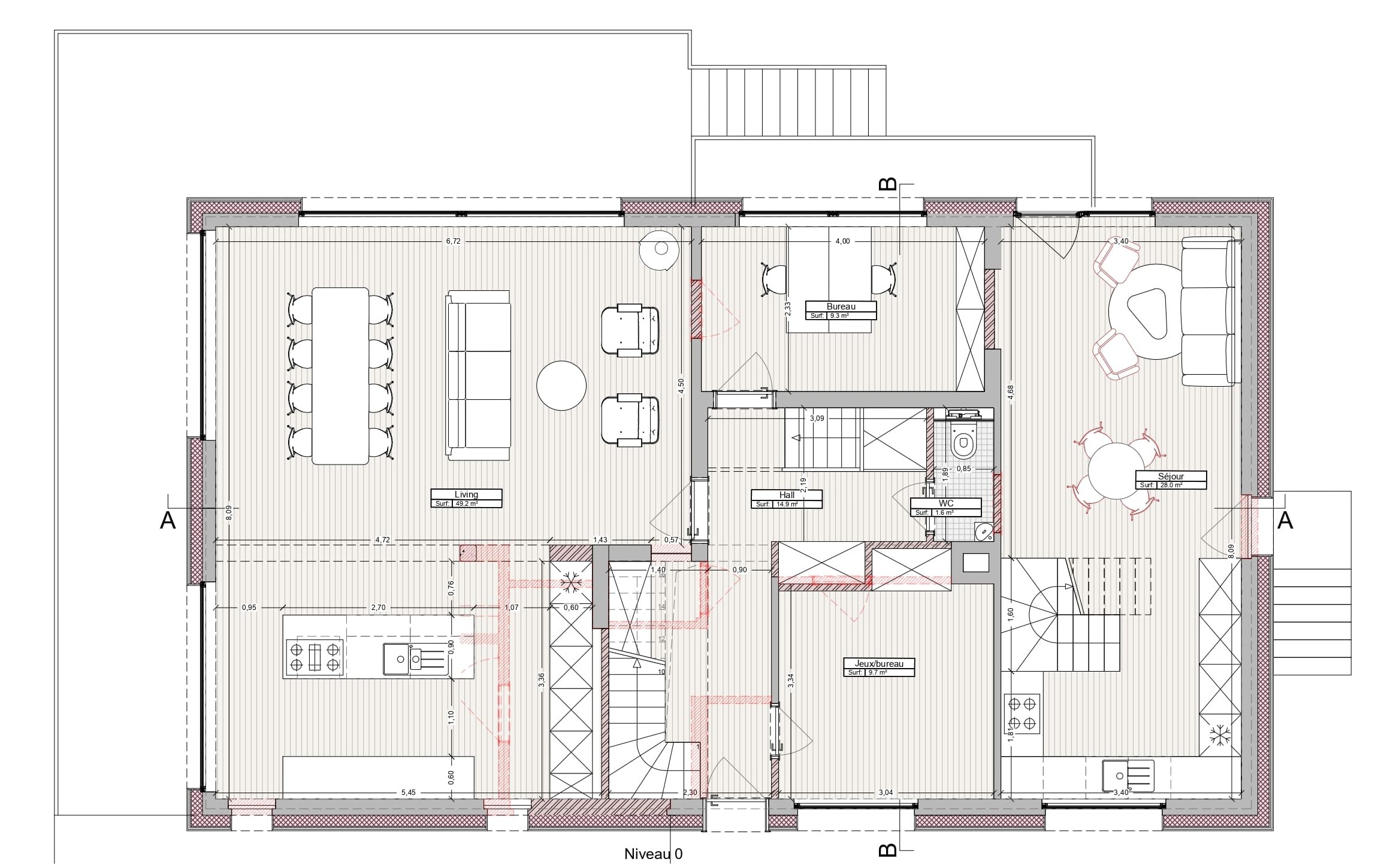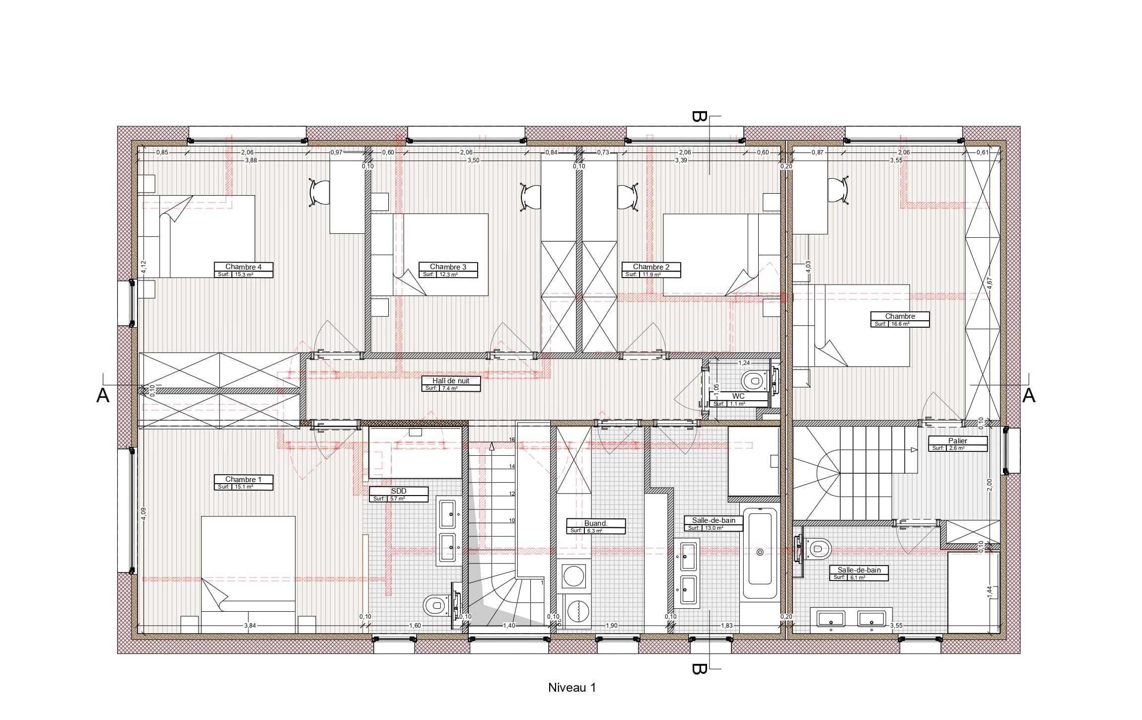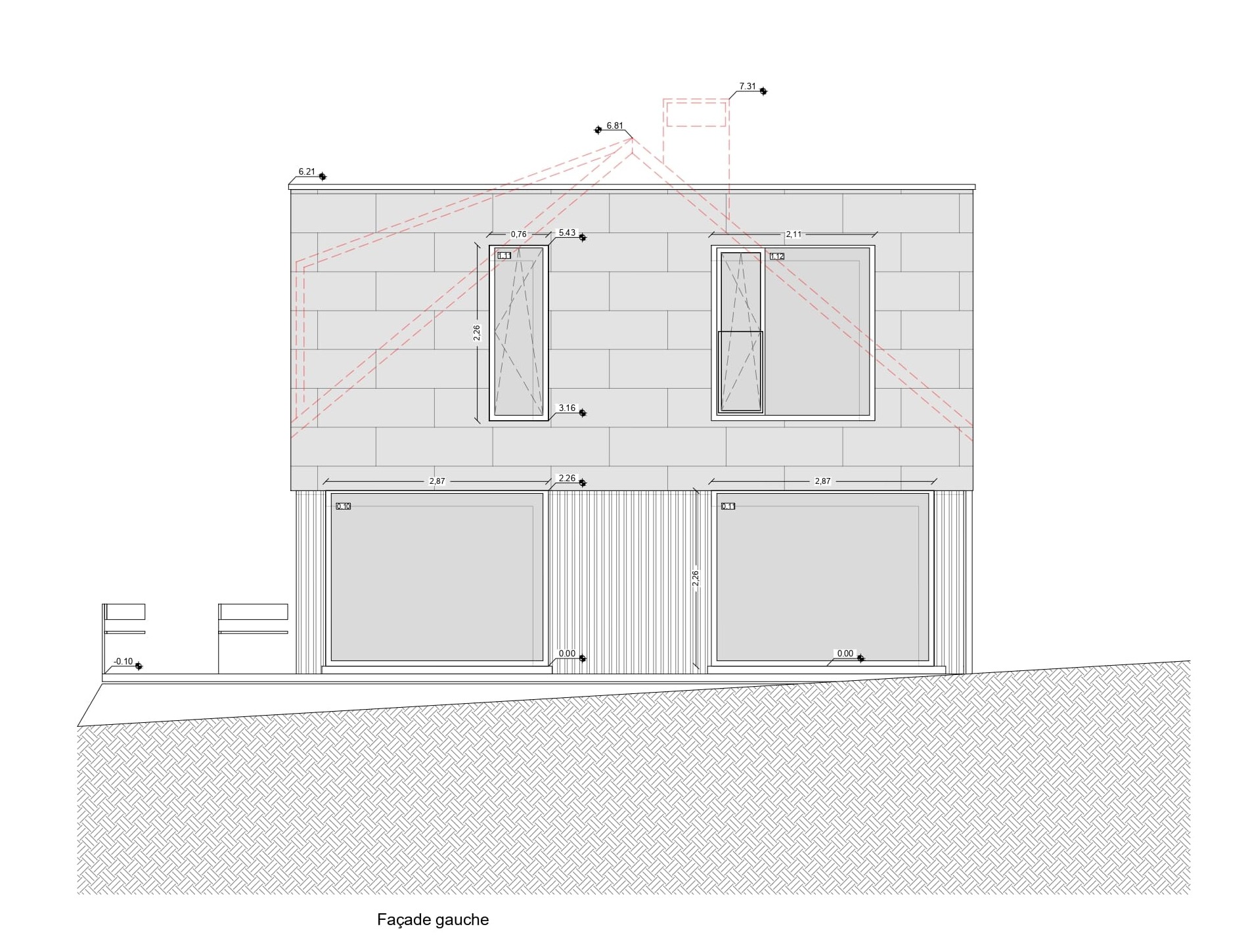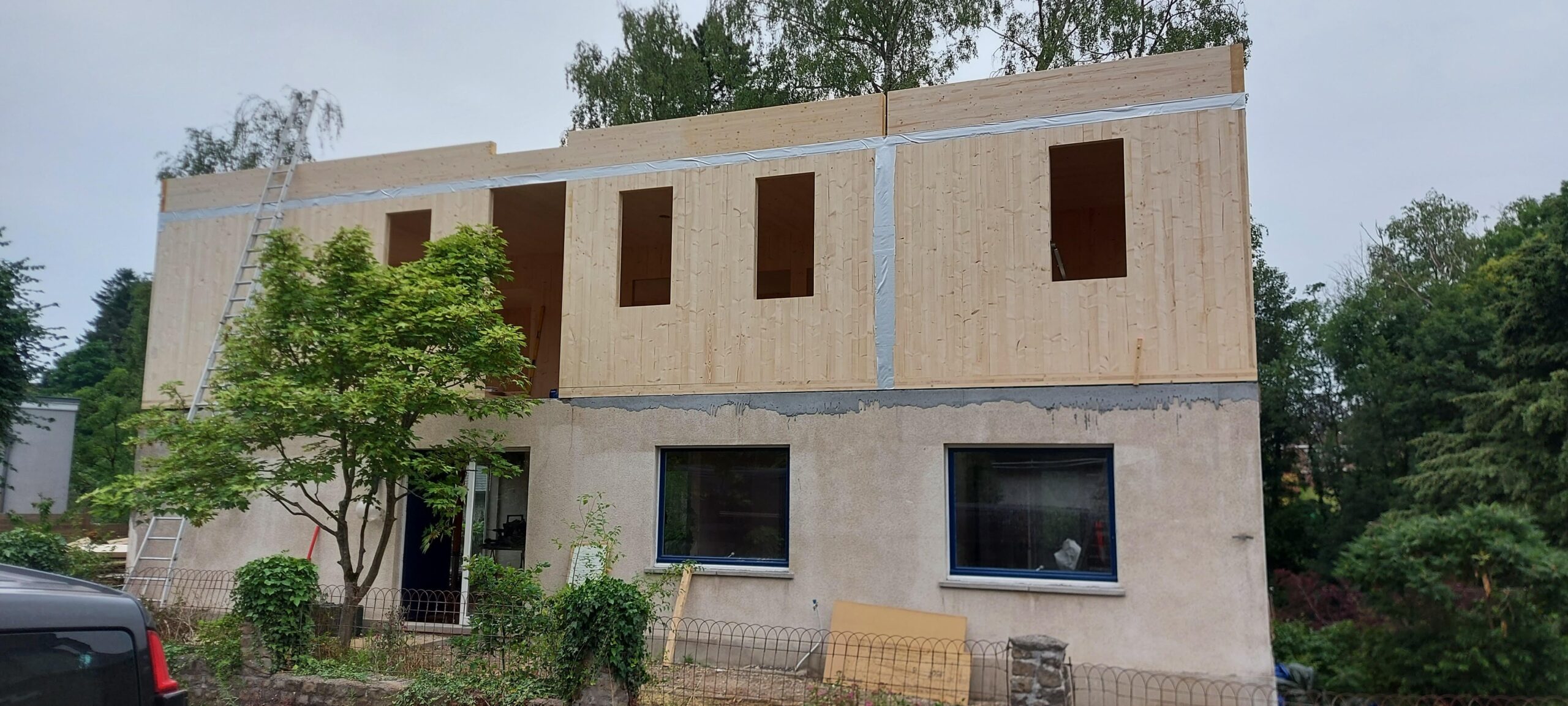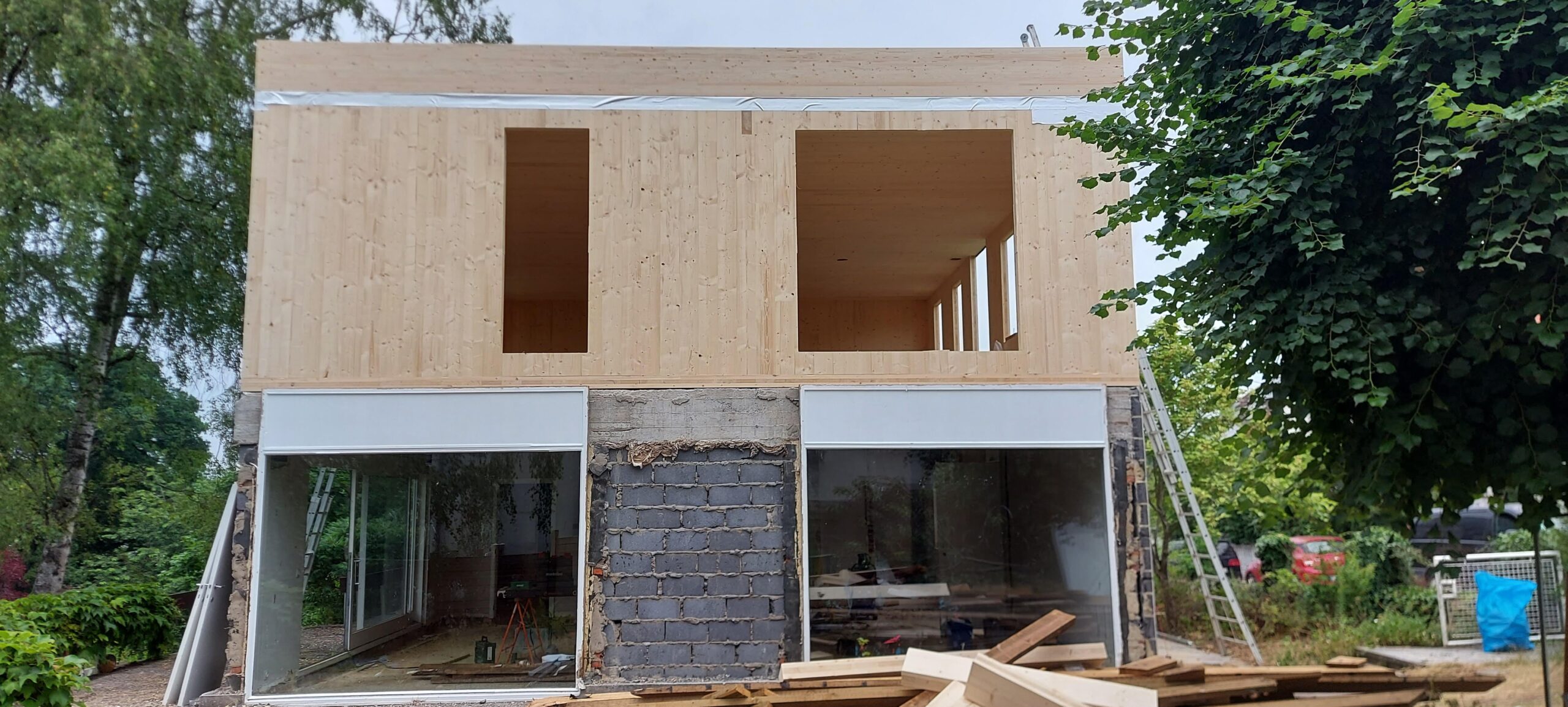 Ce projet concerne la construction d’une rehausse en CLT sur un bâtiment existant, ainsi que l’aménagement d’un petit logement duplex supplémentaire sur la droite du bâtiment.