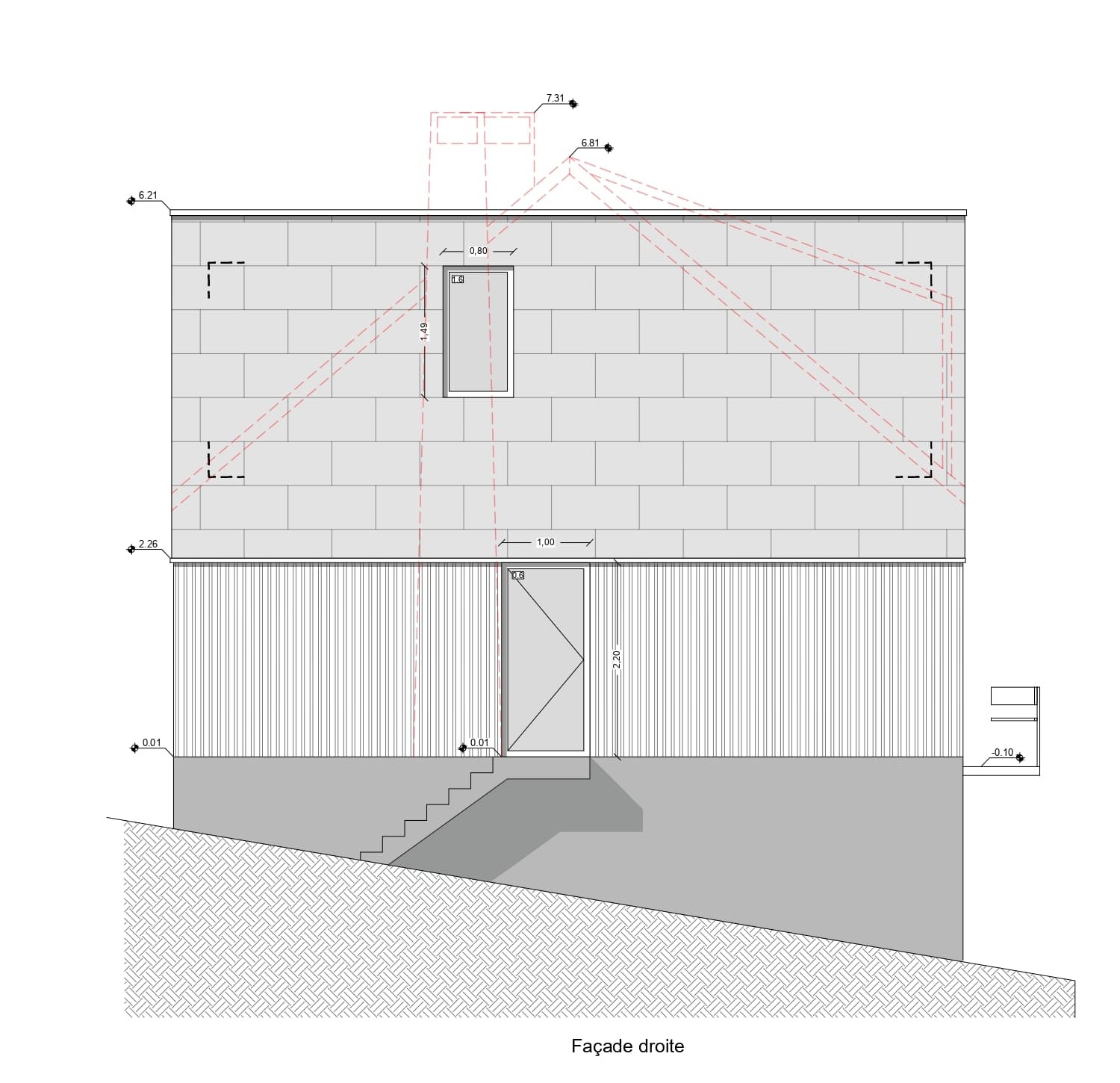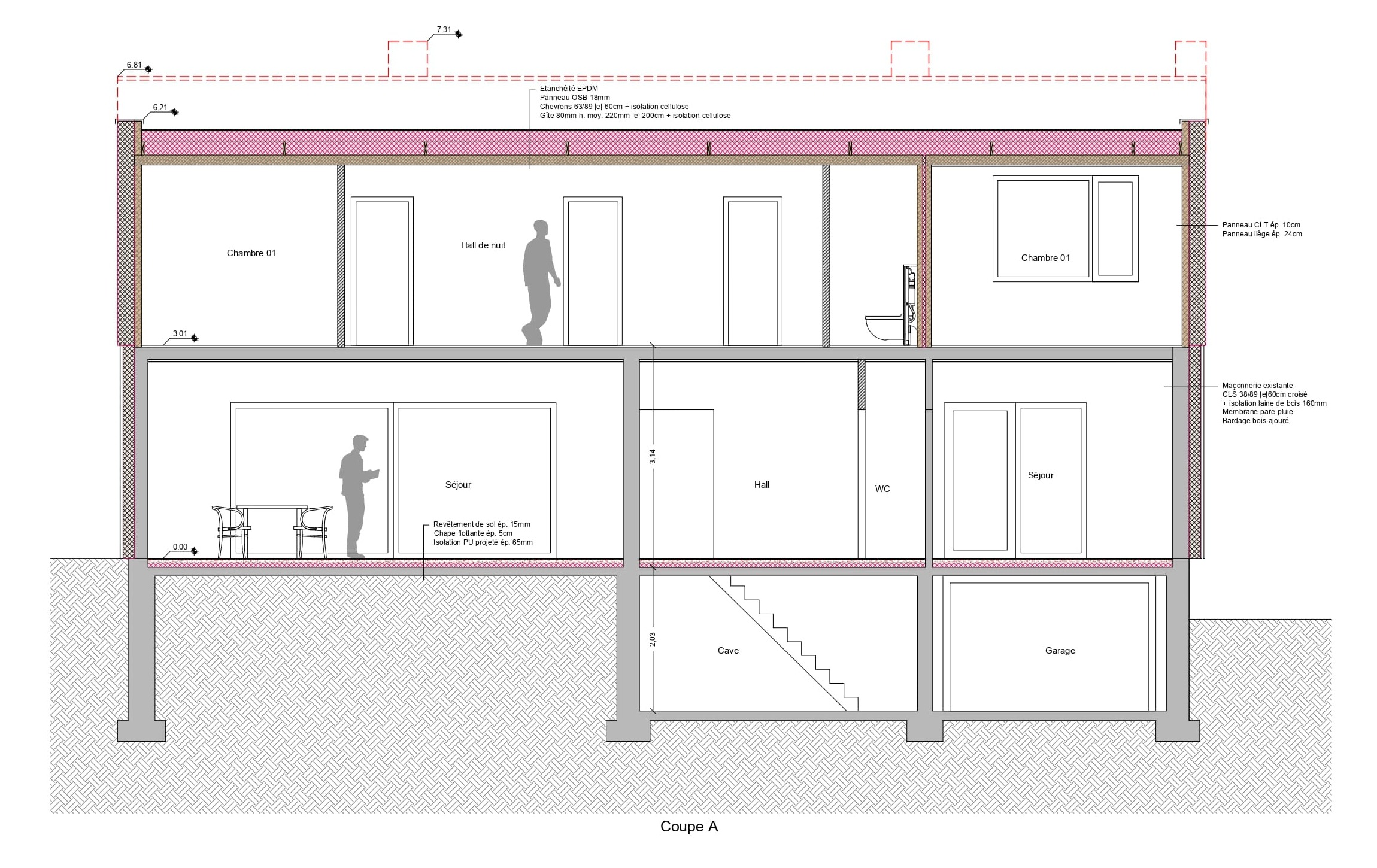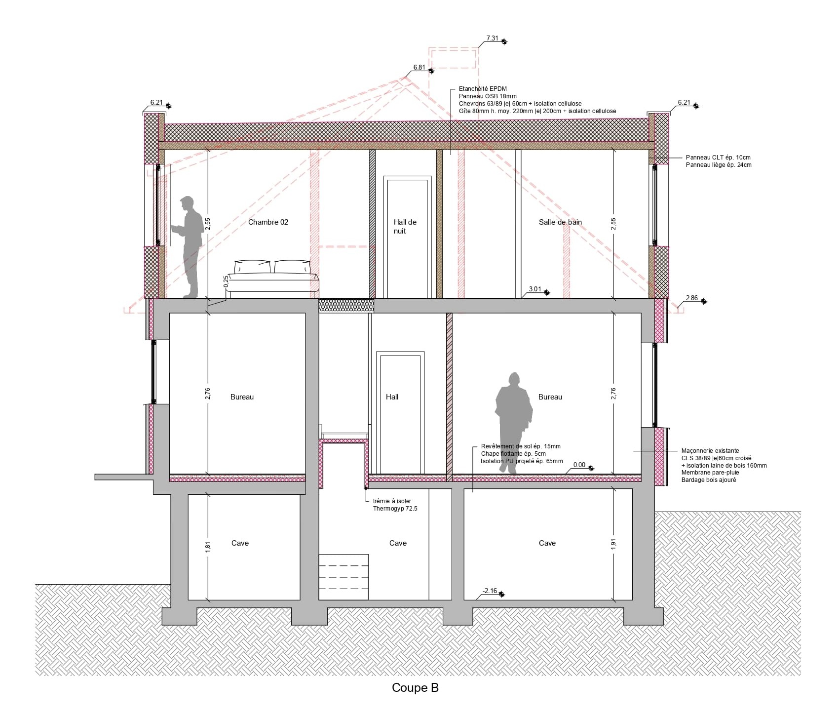 Le rez-de-chaussée existant sera isolé et couvert d’un bardage bois ajouré, et la nouvelle extension sera isolée avec des panneaux de liège expansé. Le CLT restant apparent à l’intérieur, les façades ne sont donc composées que de deux matériaux (CLT / liège).