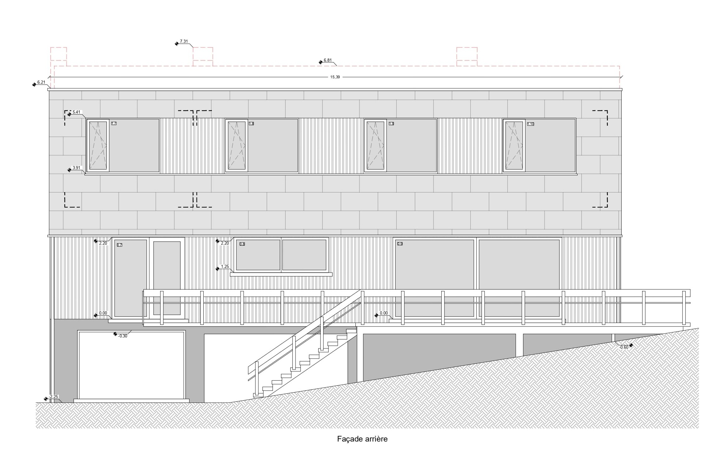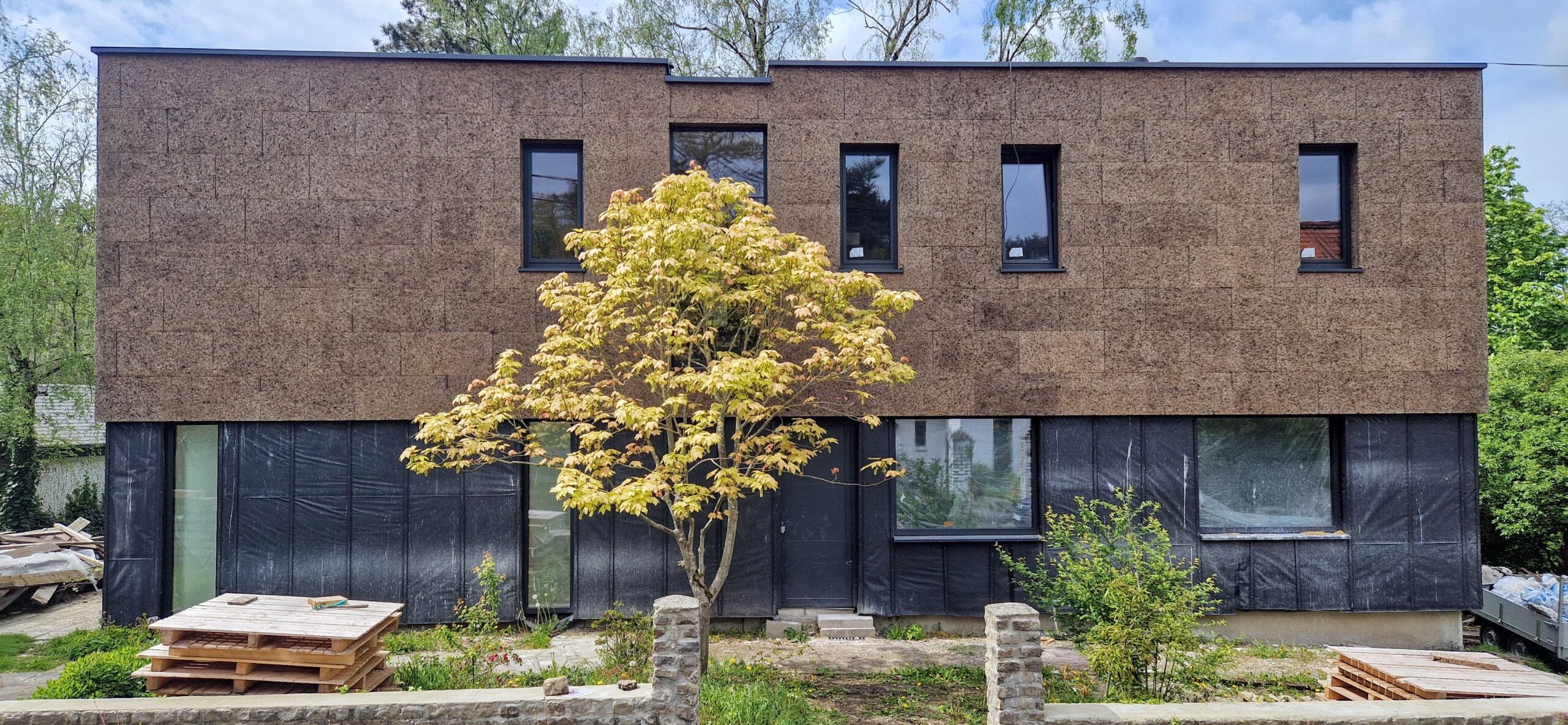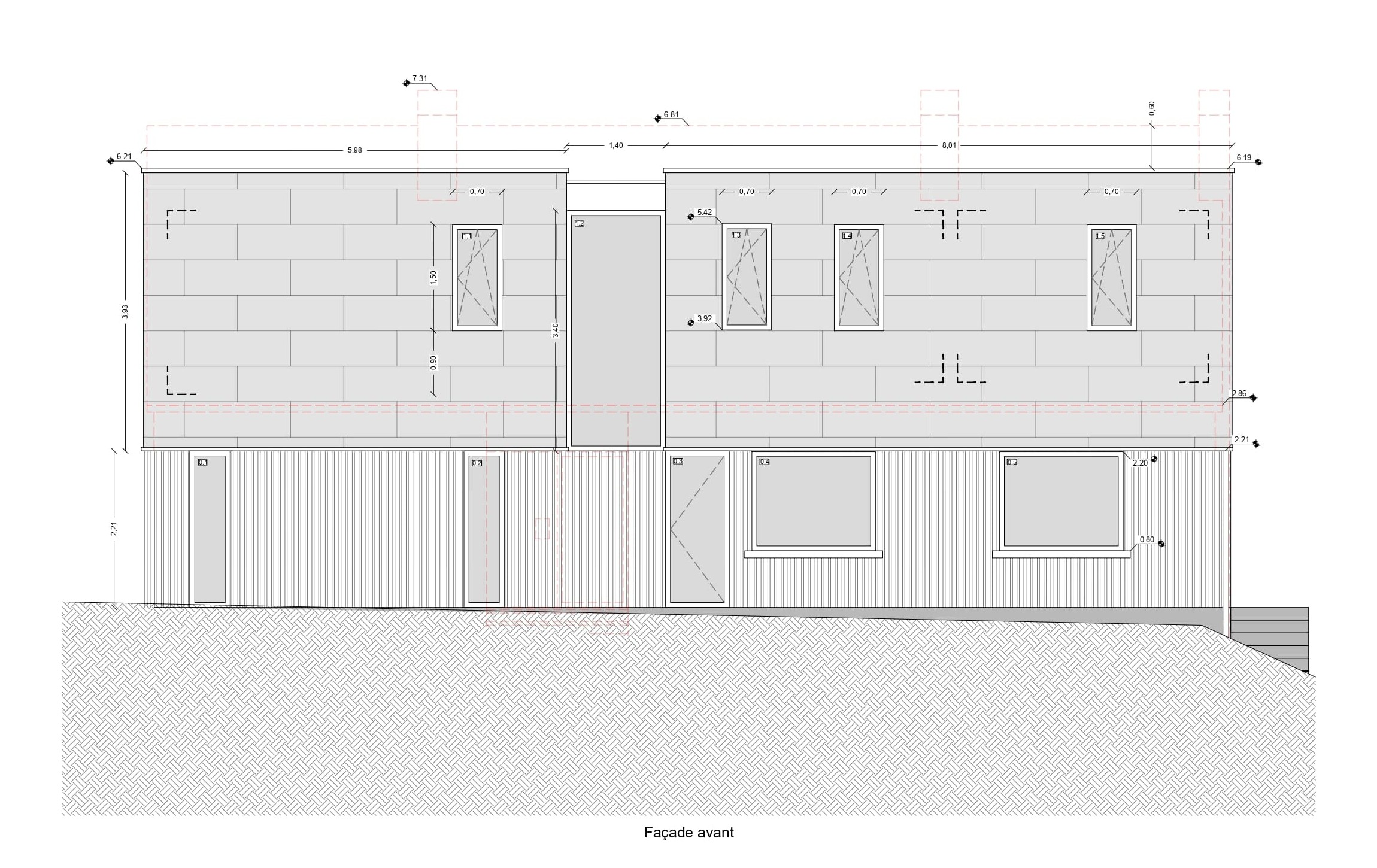 Le rez-de-chaussée existant sera isolé et couvert d’un bardage bois ajouré, et la nouvelle extension sera isolée avec des panneaux de liège expansé. Le CLT restant apparent à l’intérieur, les façades ne sont donc composées que de deux matériaux (CLT / liège).