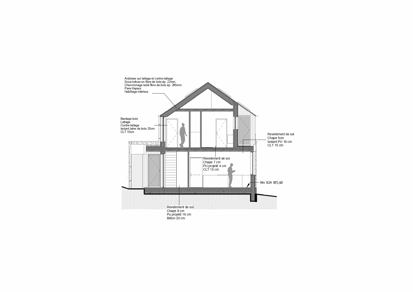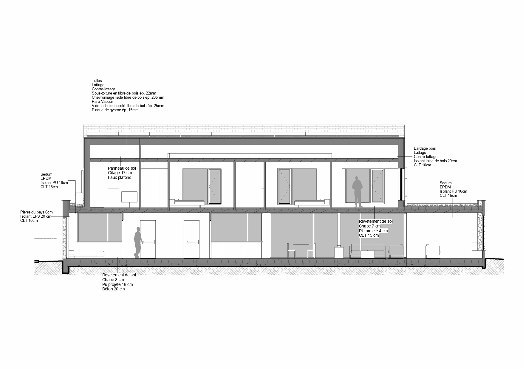 La construction est prévue en CLT apparent à l’intérieur, avec un parement extérieur en bardage bois et en pierre de schiste local.